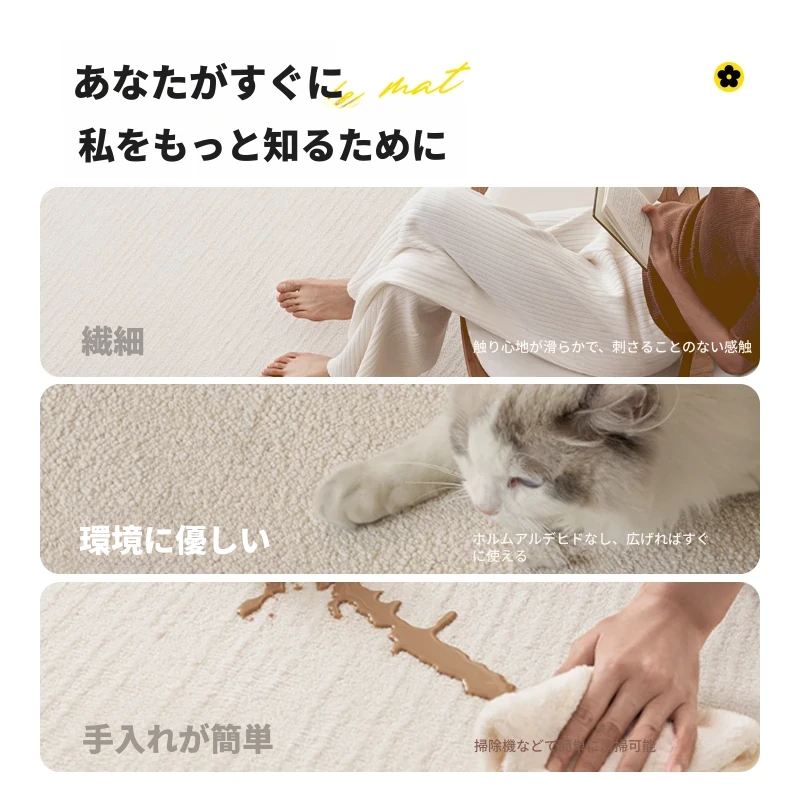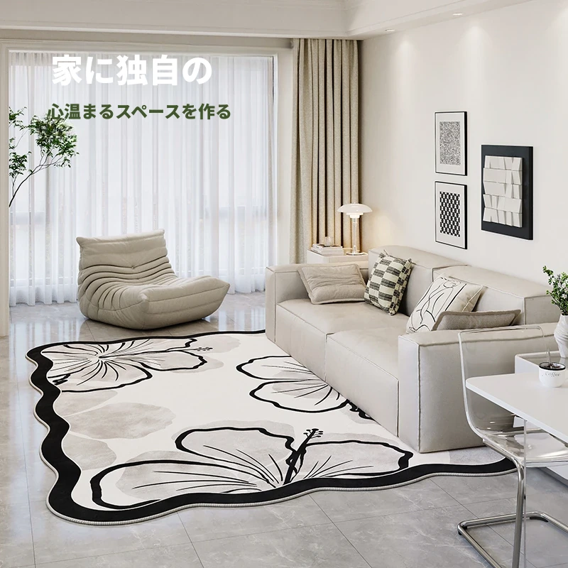美世達のリビングカーペット、2024年新作!お手入れ不要の洗えるティーテーブルマット、ソファーの下にぴったり。クリーミーなデザインで、どんなインテリアにもマッチ!お家をおしゃれに彩ります。
