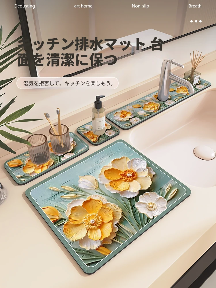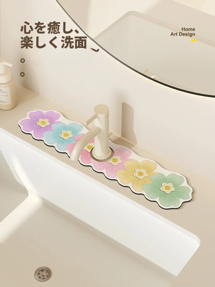 ミスターダ水栓用吸水マット 防水・油汚れ防止 キッチン用花柄洗面台ドレインマット 幅狭でカット可能!おしゃれで機能的、キッチンを清潔に保つ必需品!