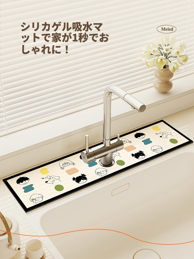 カスタマイズ可能な水栓台面吸水マット - キッチンや洗面所に最適なカラフルなデザイン!スリムでシリコン製、デザイン性と防水性を兼ね備えた沥水マット。あなたの空間をおしゃれに演出します!