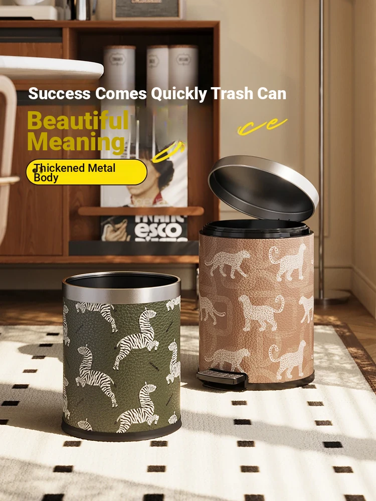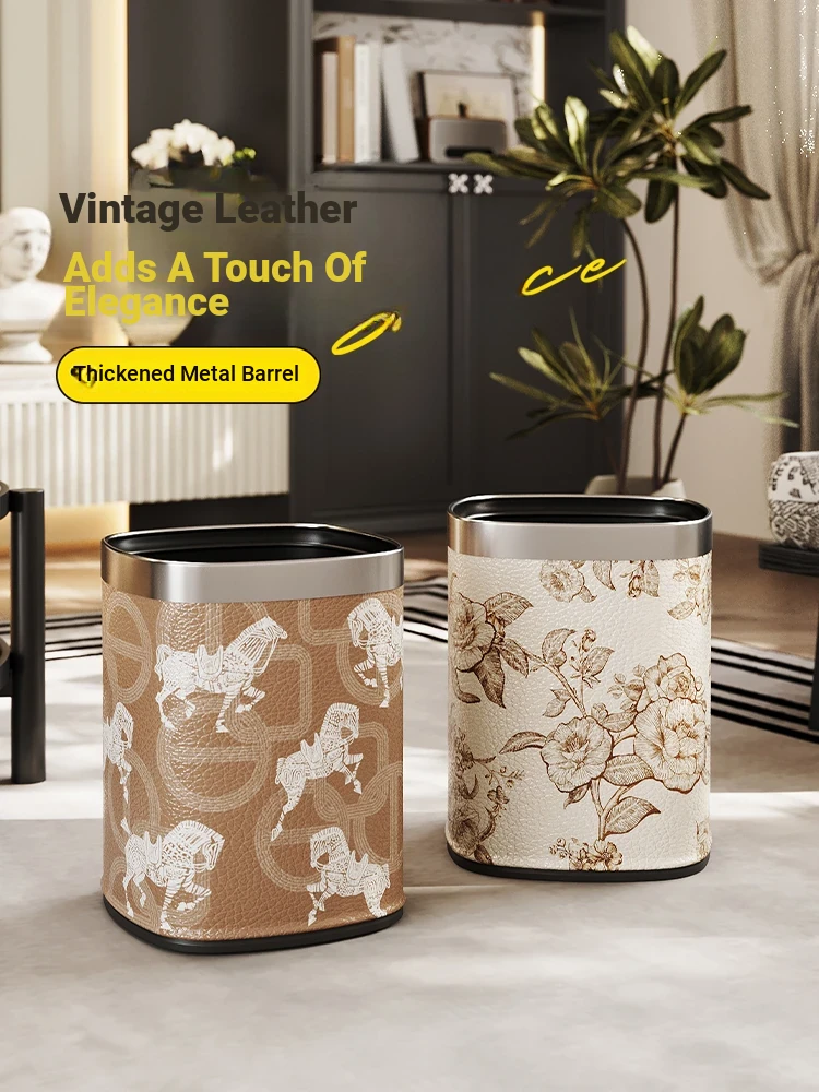 Stylish Stainless Steel Leather Trash Can - Vintage Large Foot Pedal Bin with Lid for Home Living Room and Bathroom