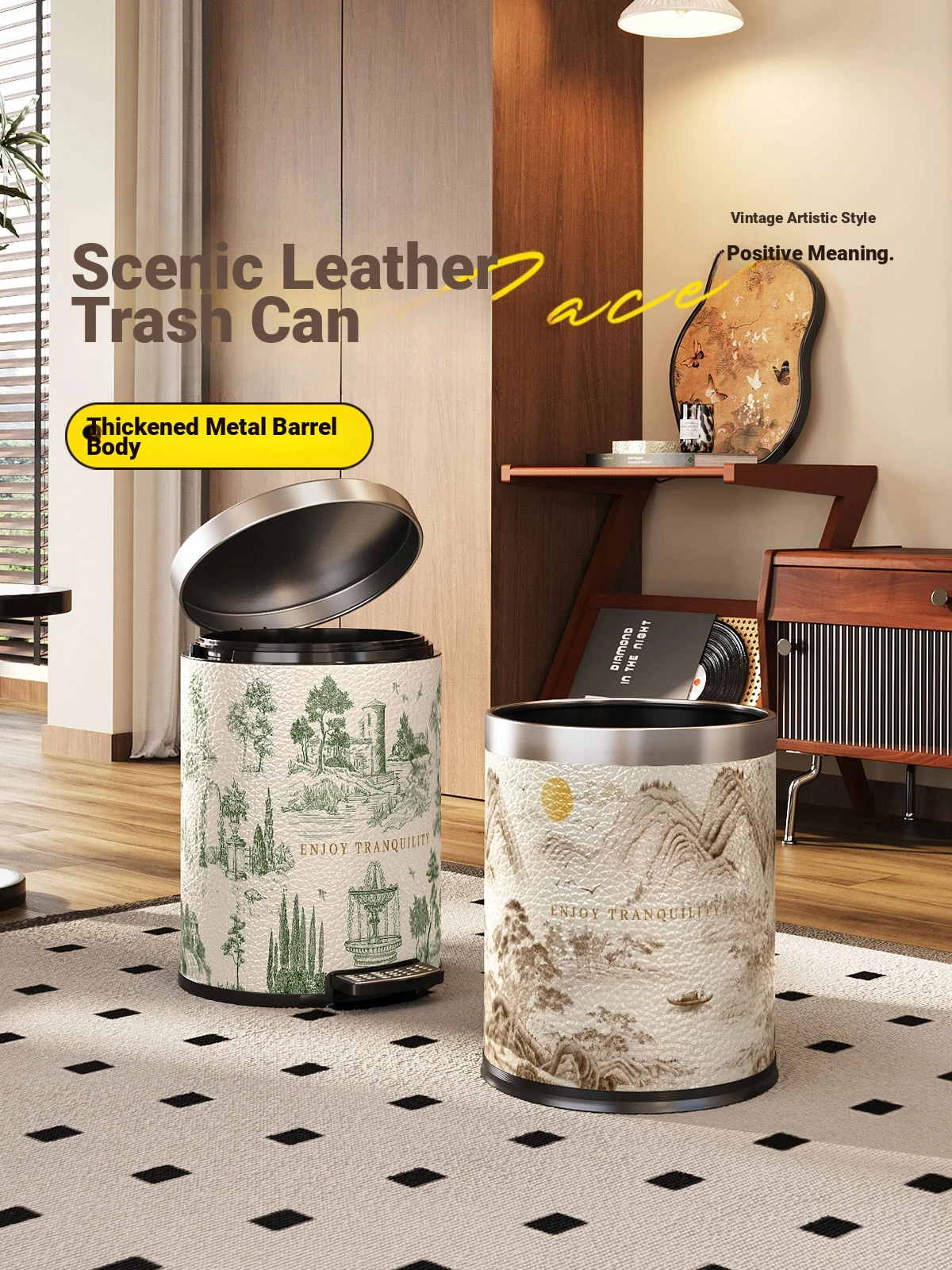 Meisida Stainless Steel Trash Can - Vintage Landscape Design with Foot Pedal and Lid, Perfect for Home Use in Living Room and Bathroom, New Collection