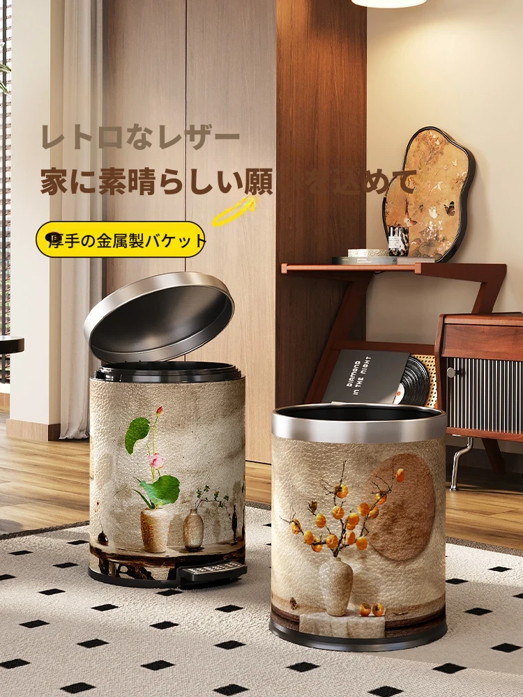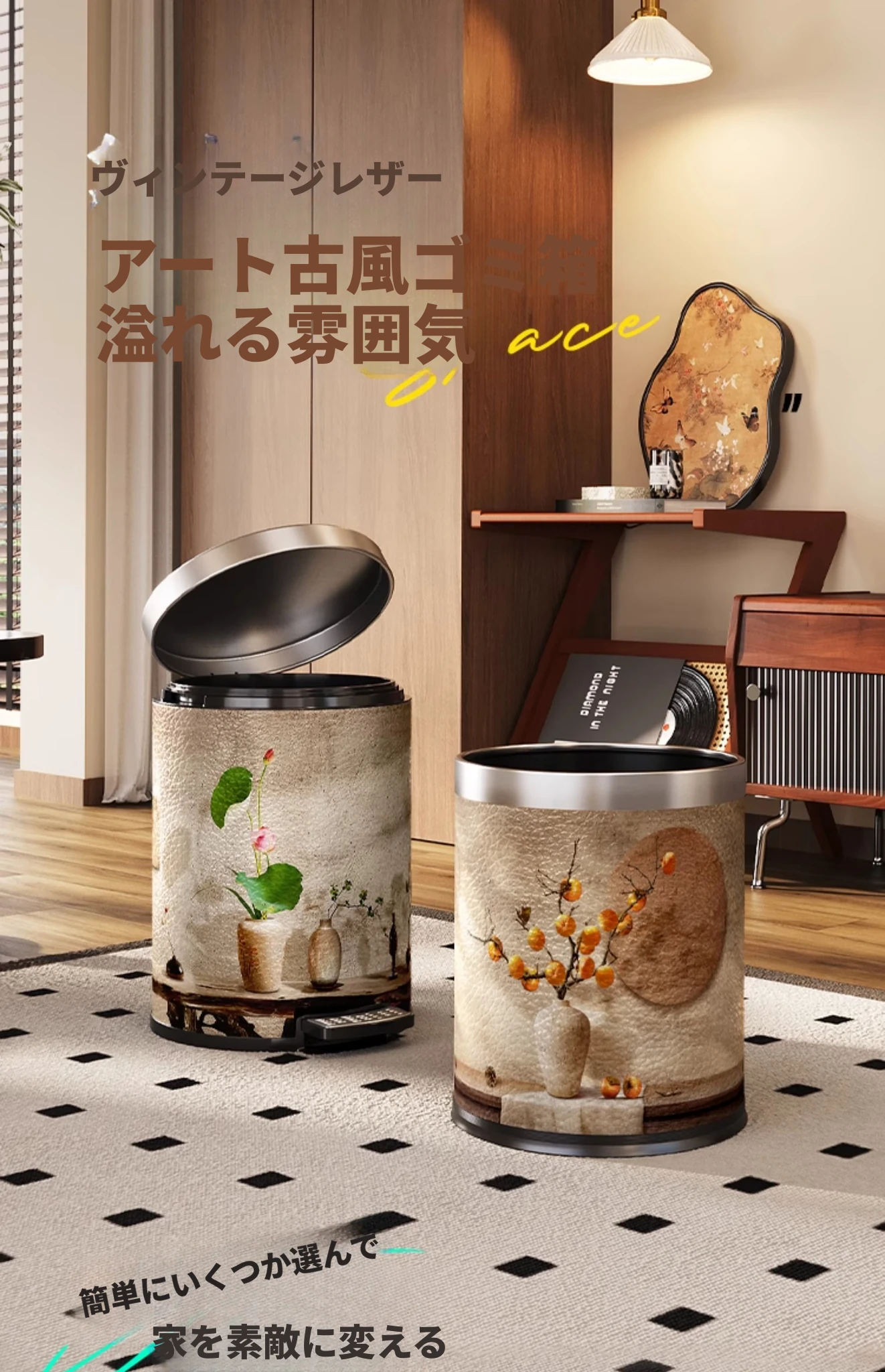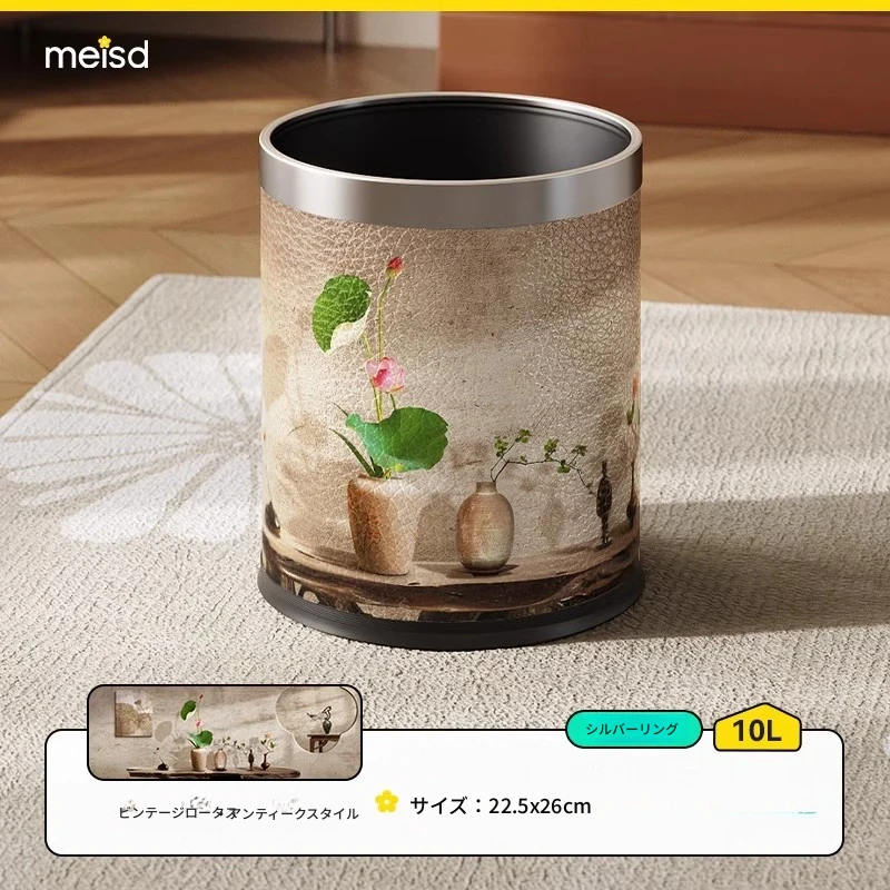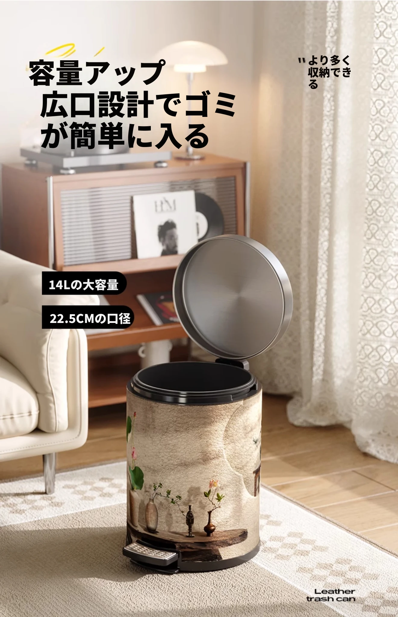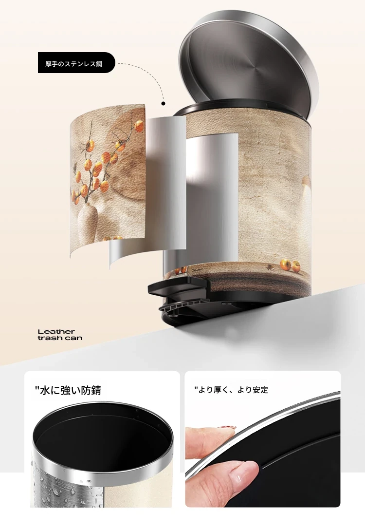 美世达のステンレススチールレザーゴミ箱|おしゃれで高級感溢れる中古風デザイン|家用・トイレに最適な大容量タイプ|美しい空間を演出する必須アイテム!